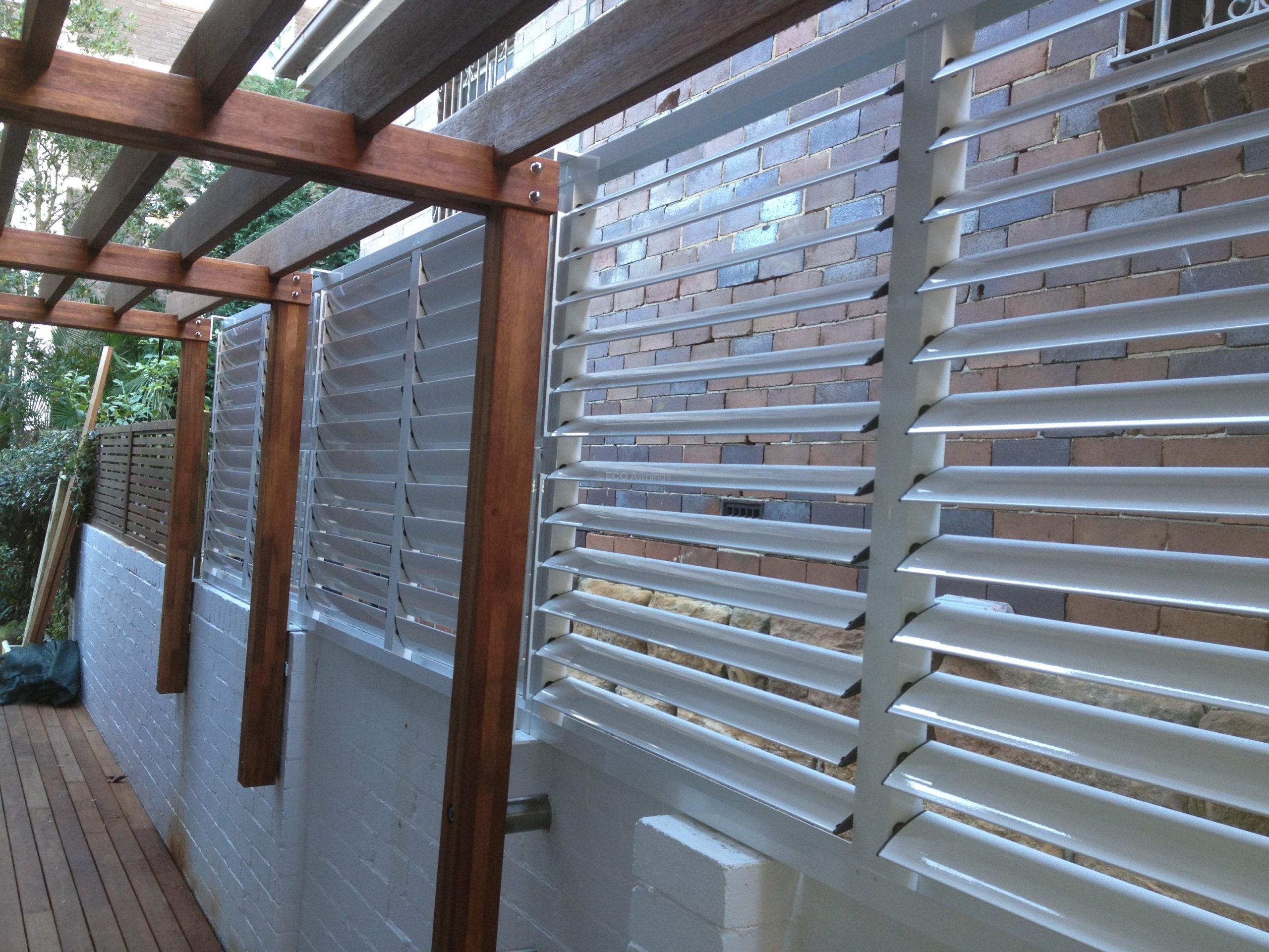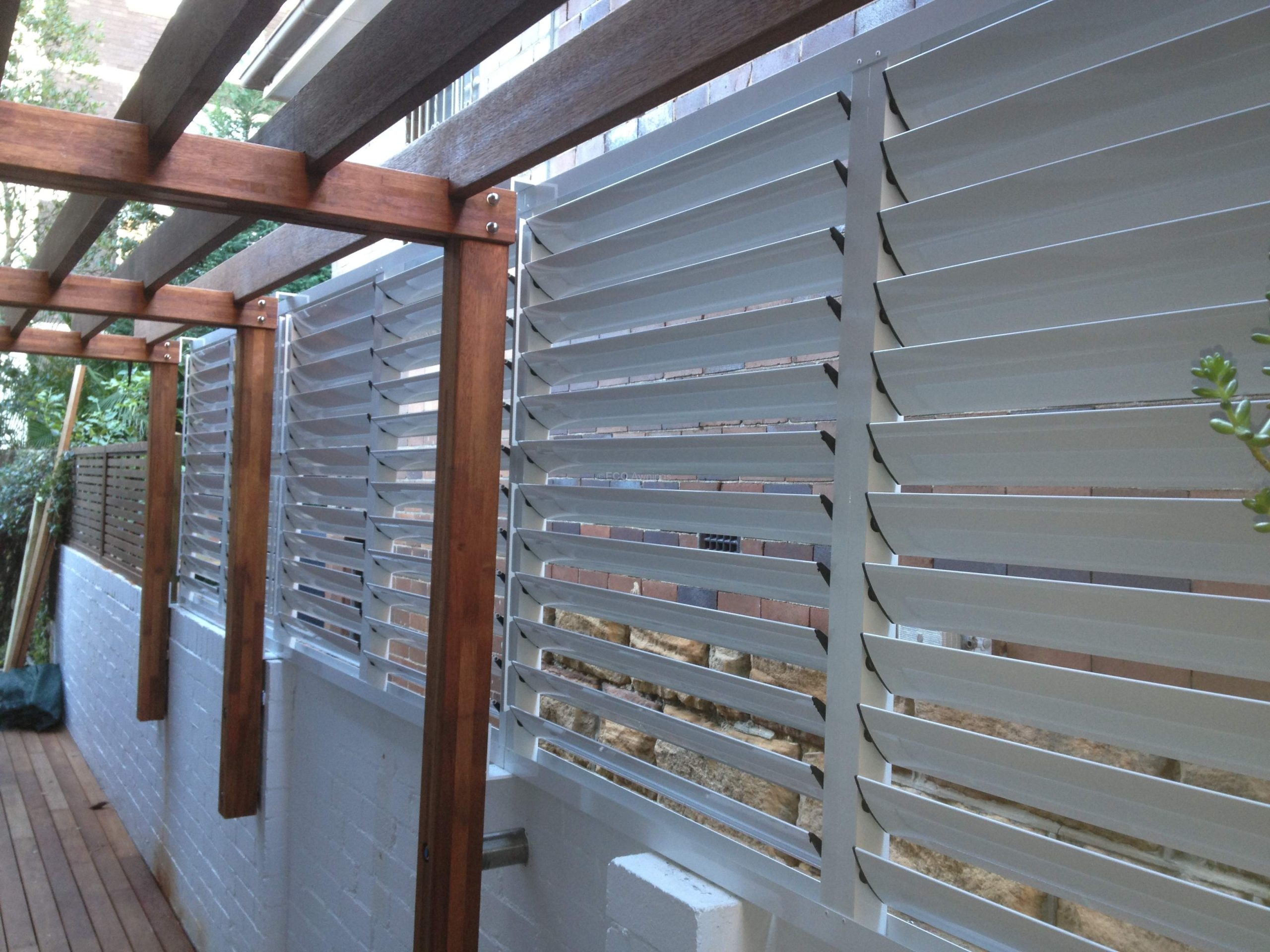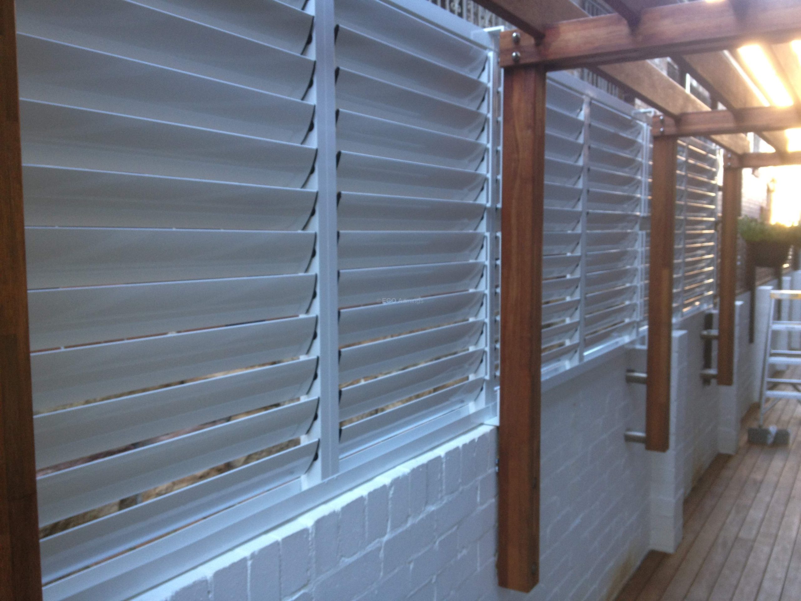 Privacy louvers with 85mm adjustable Blades mounted in a fixed frame on top of a wall