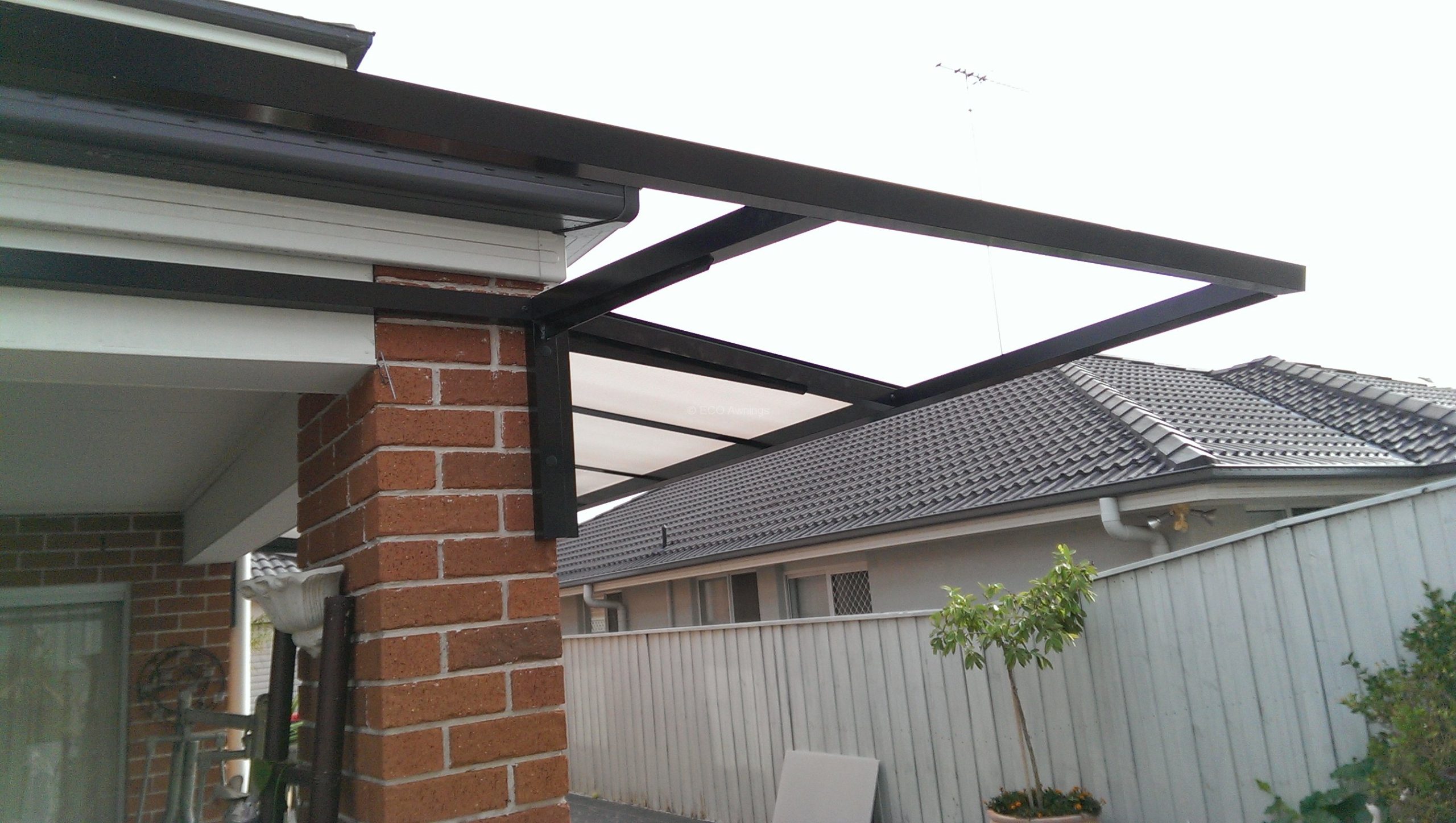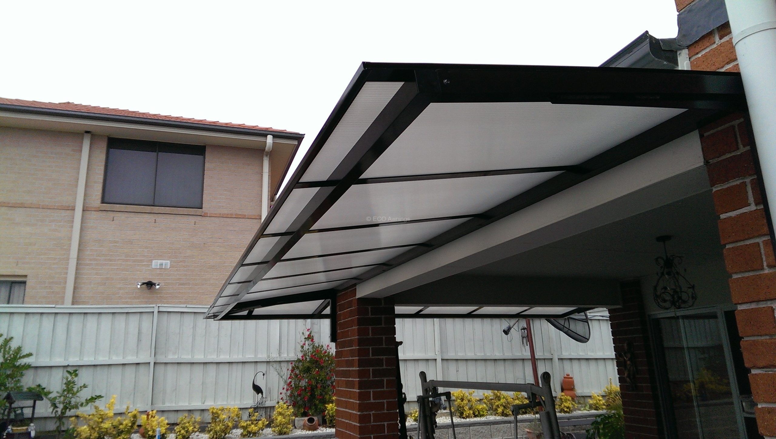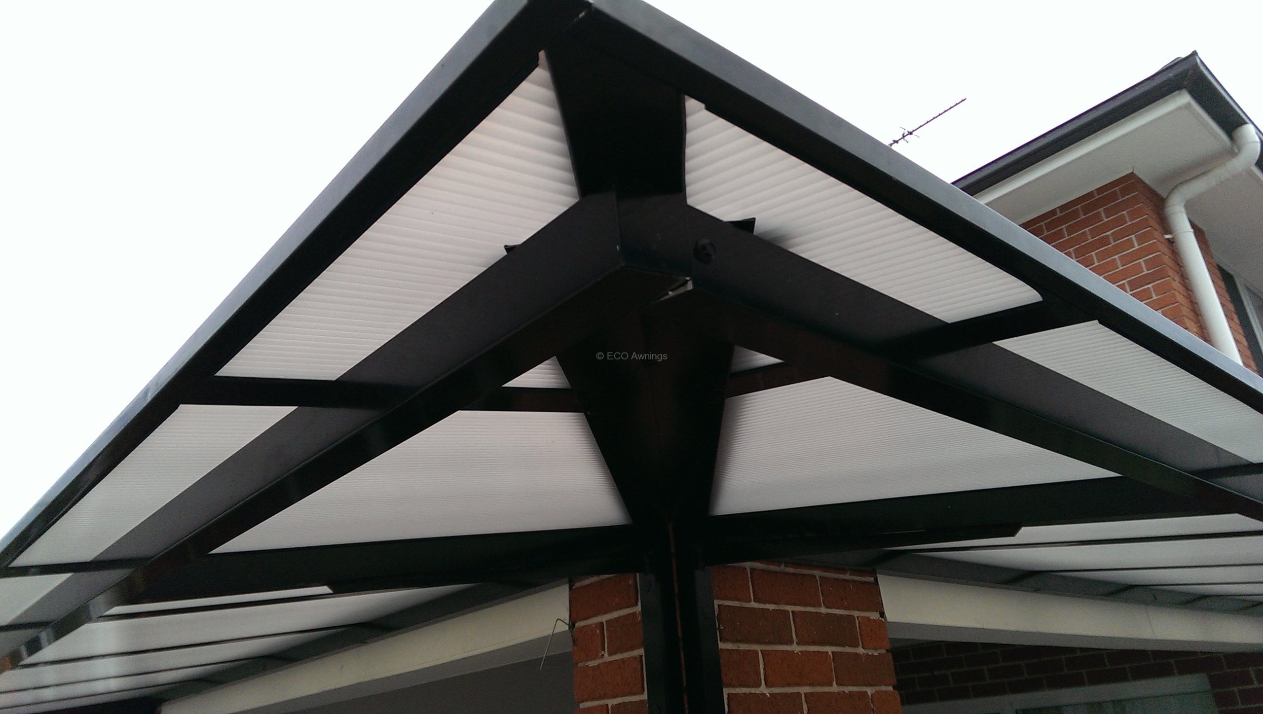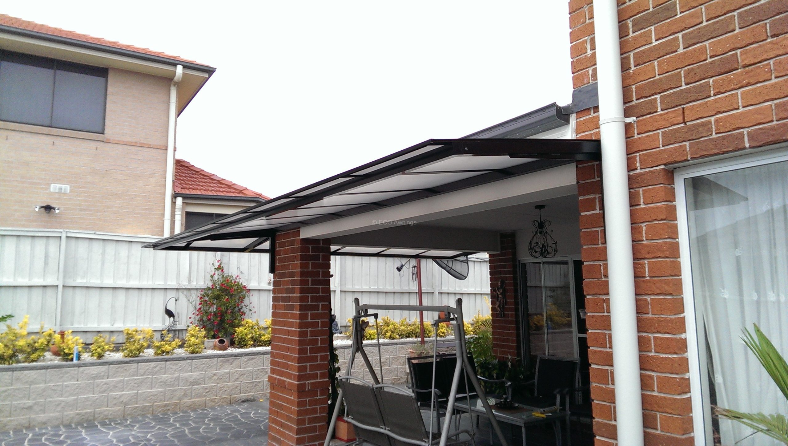 This Canter Lever Awnings was Custom made to Mounted around a Patio to give better protection from sun and rain the frame is 100×50 box frame white frame with solar ice polycarb.