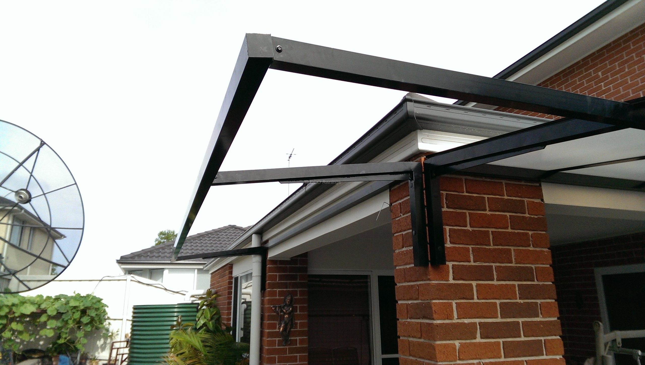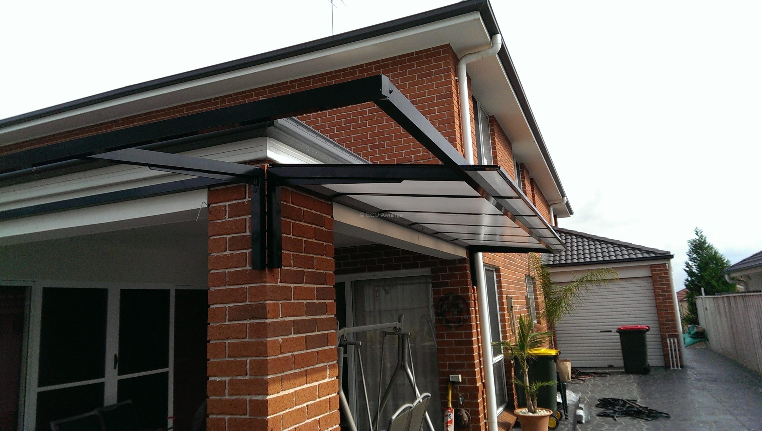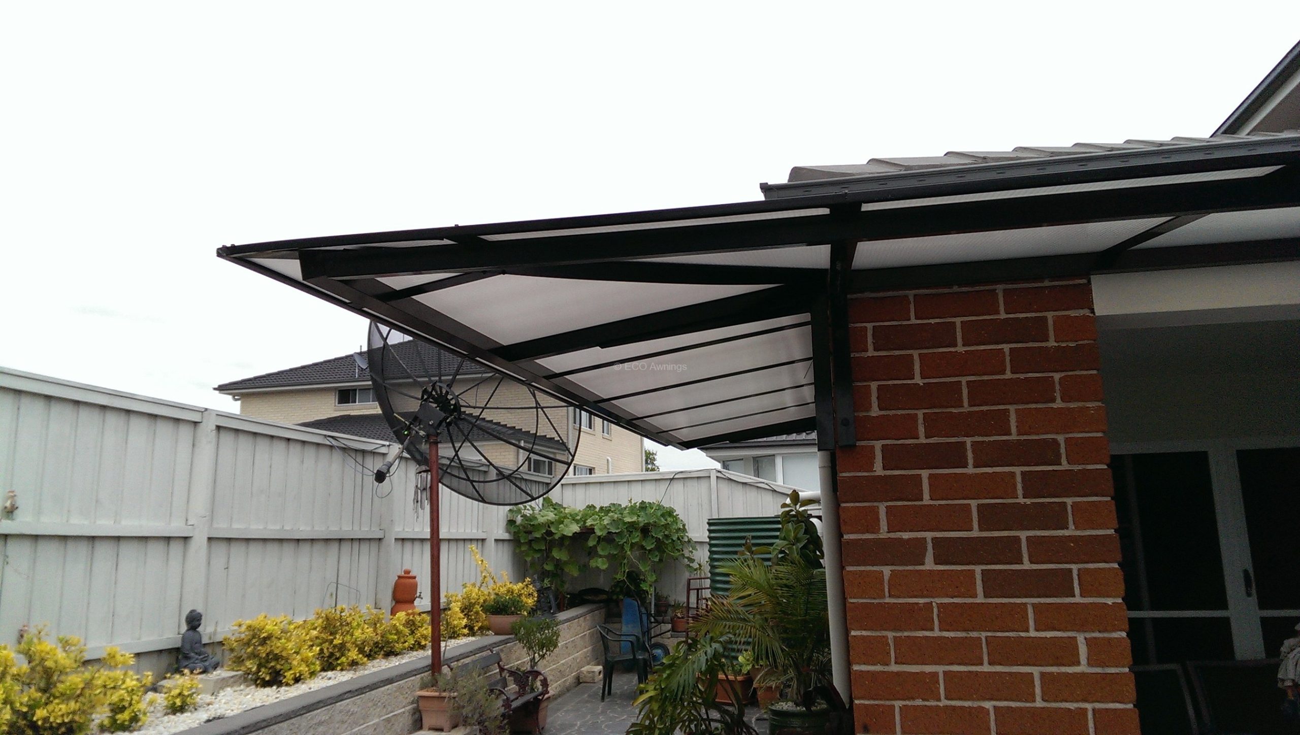 This Canter Lever Awnings was Custom made to Mounted around a Patio to give better protection from sun and rain the frame is 100×50 box frame white frame with solar ice polycarb.