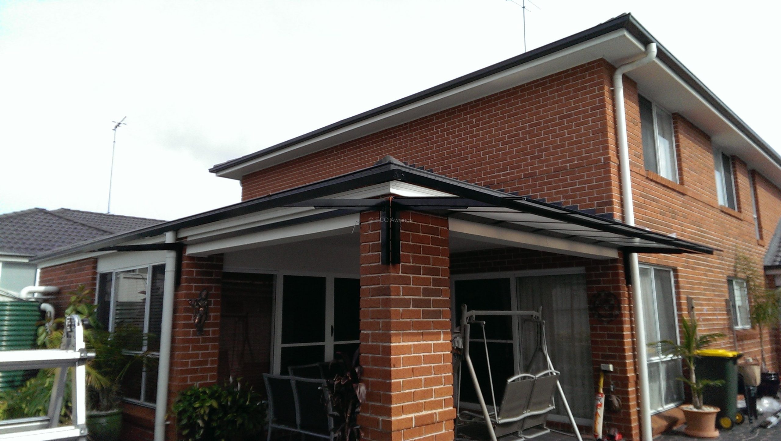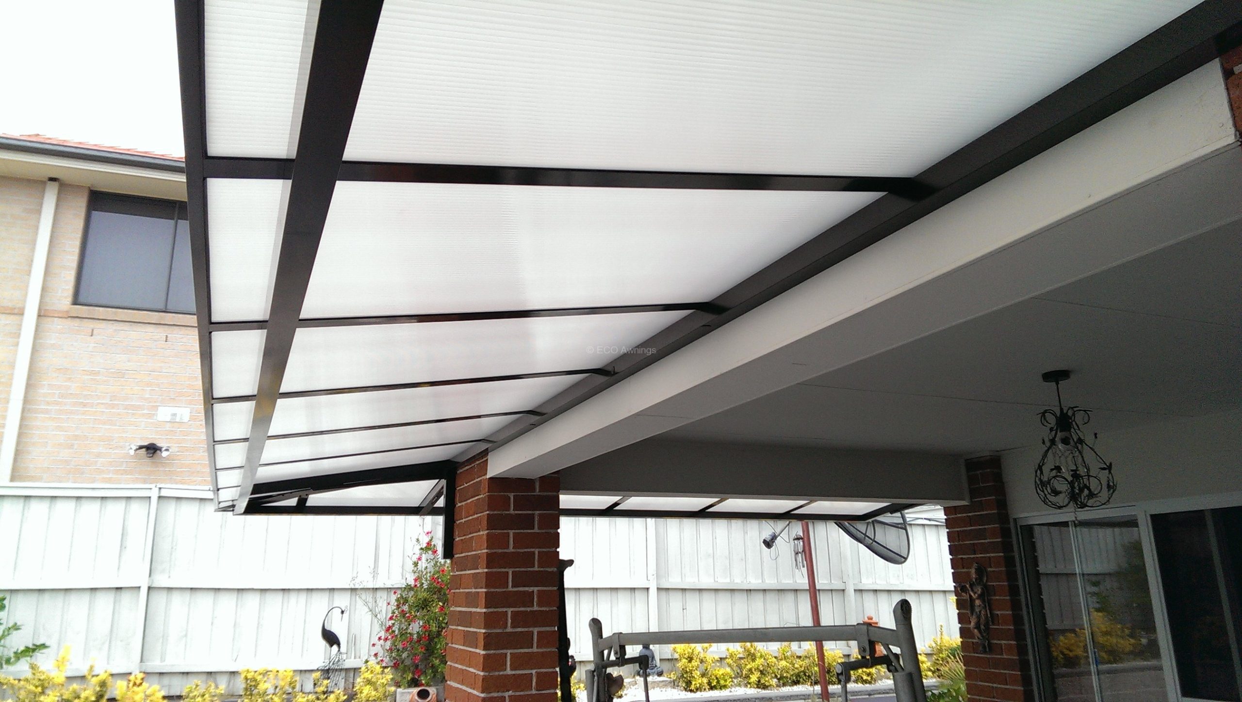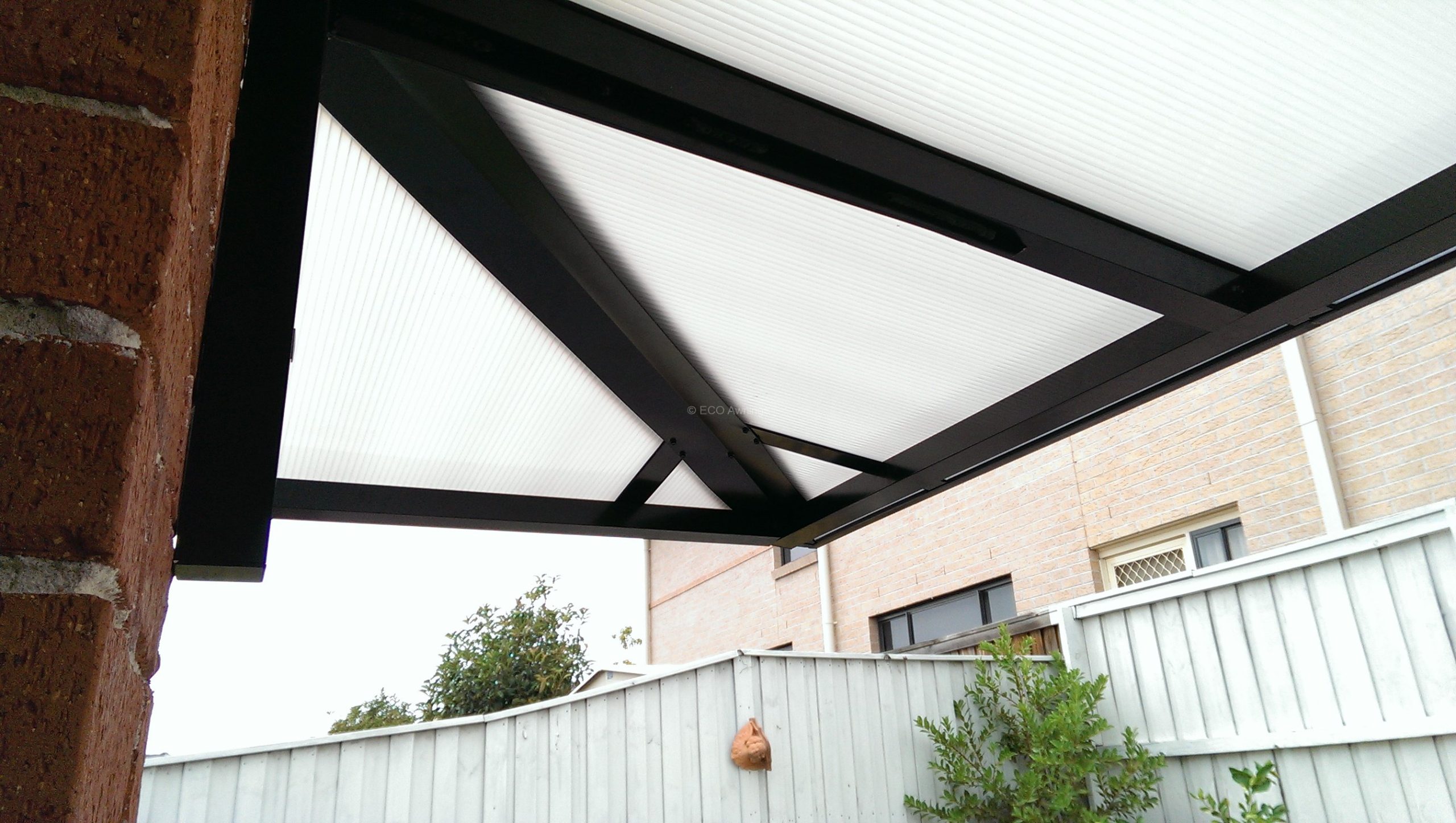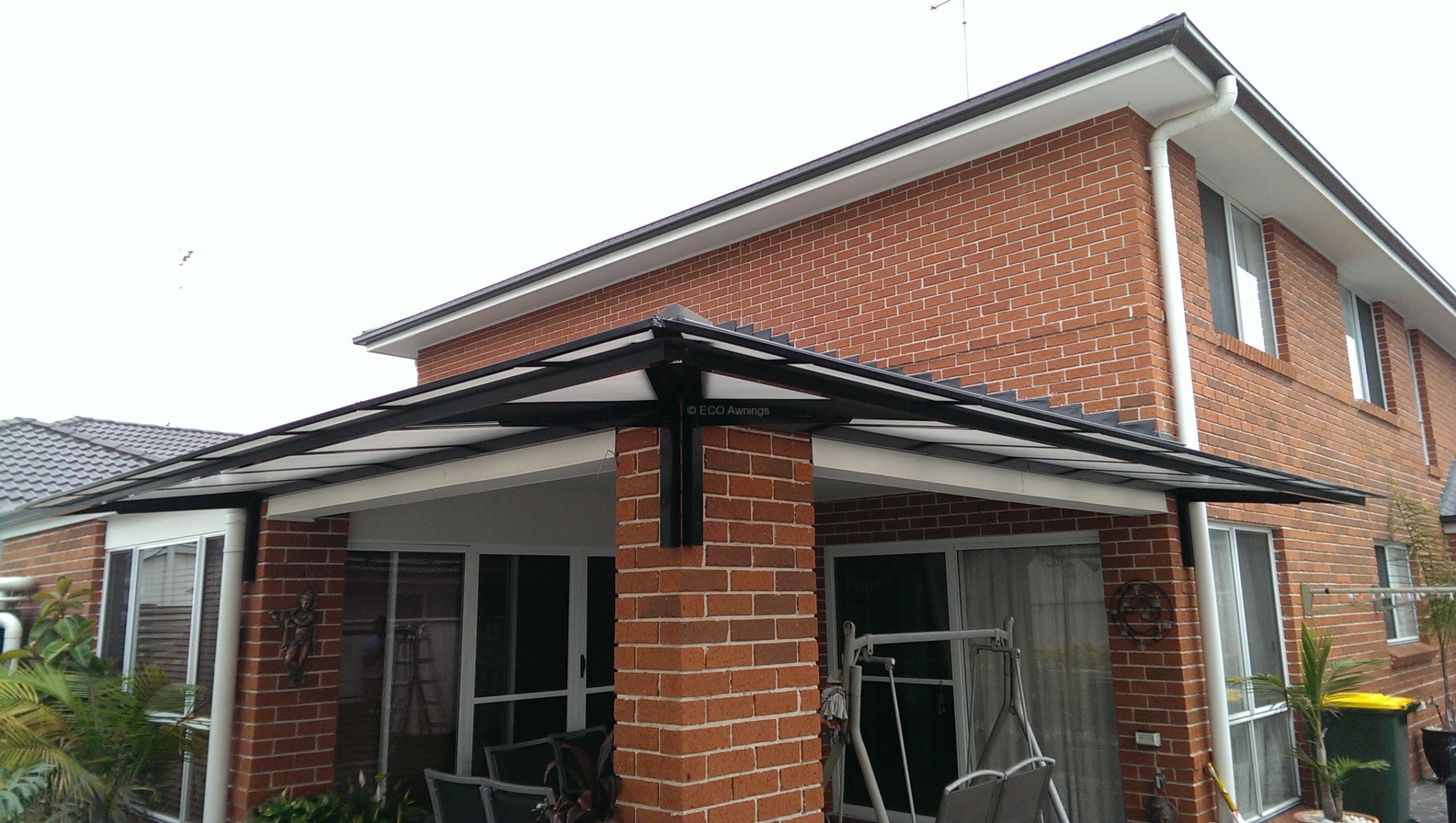 This Canter Lever Awnings was Custom made to Mounted around a Patio to give better protection from sun and rain the frame is 100×50 box frame white frame with solar ice polycarb.