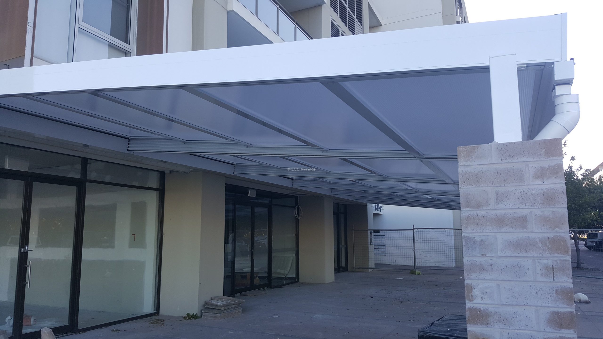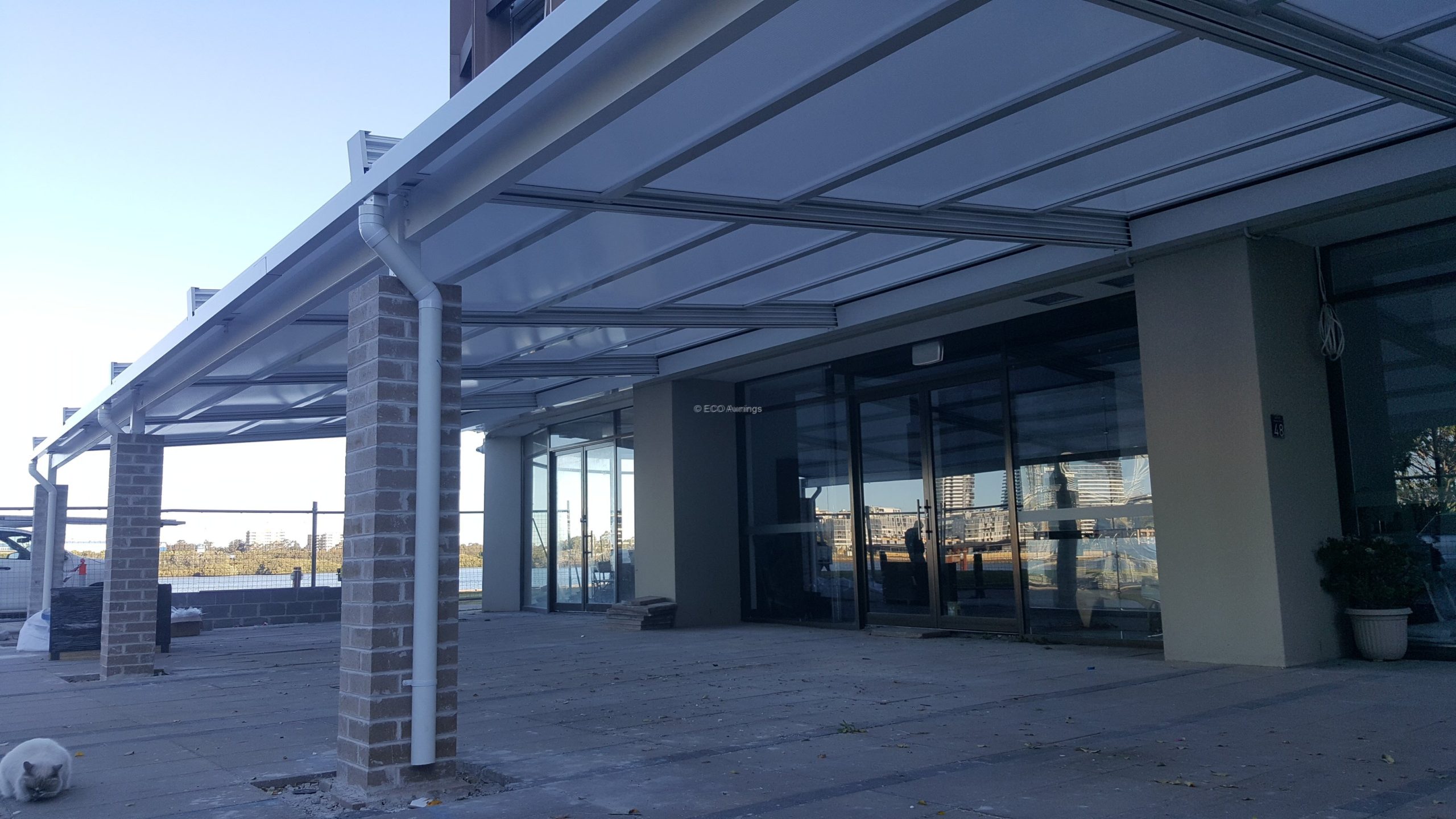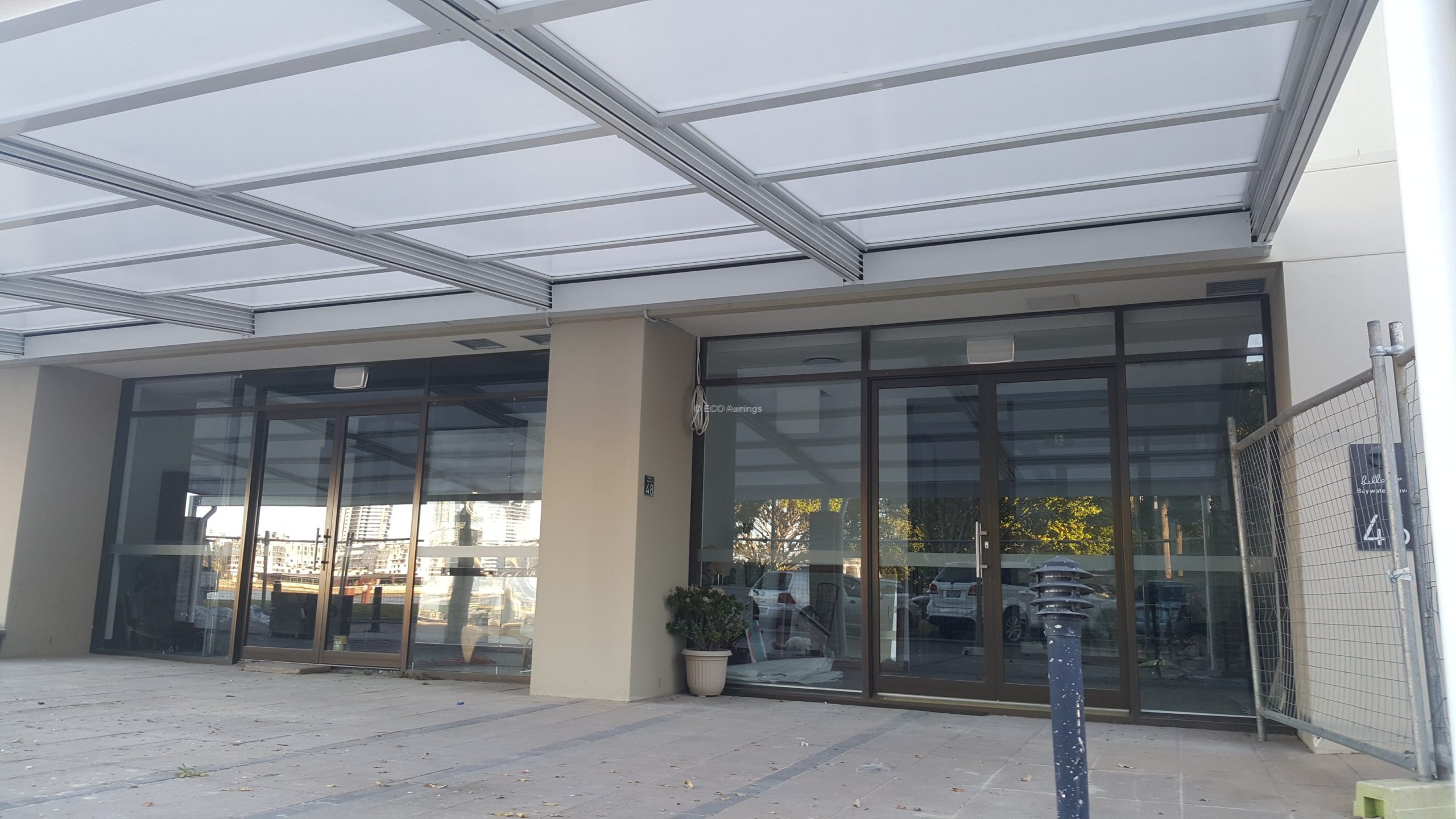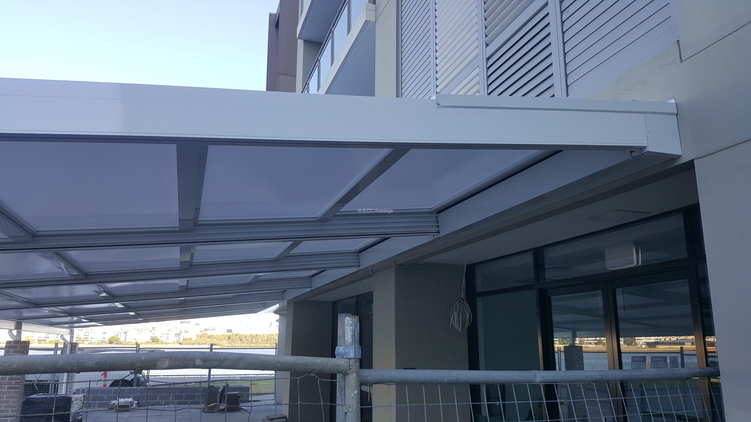 This Retracta Roof with 6 bays, 5 Polycarb Panels and powder coated frame, has been installed at the front of a new Wentworth Point Restaurant site, hence gaining a weatherproof outdoor seating area. The Retracta Roof with 6 bays, 5 Polycarb Panels in this installation requires a minimum roof pitch of 6°. The Retracta Roof with 6 bays, 5 Polycarb Panels can be mounted on an external wall or above a roof line as required, therefore has flexible fitting options.