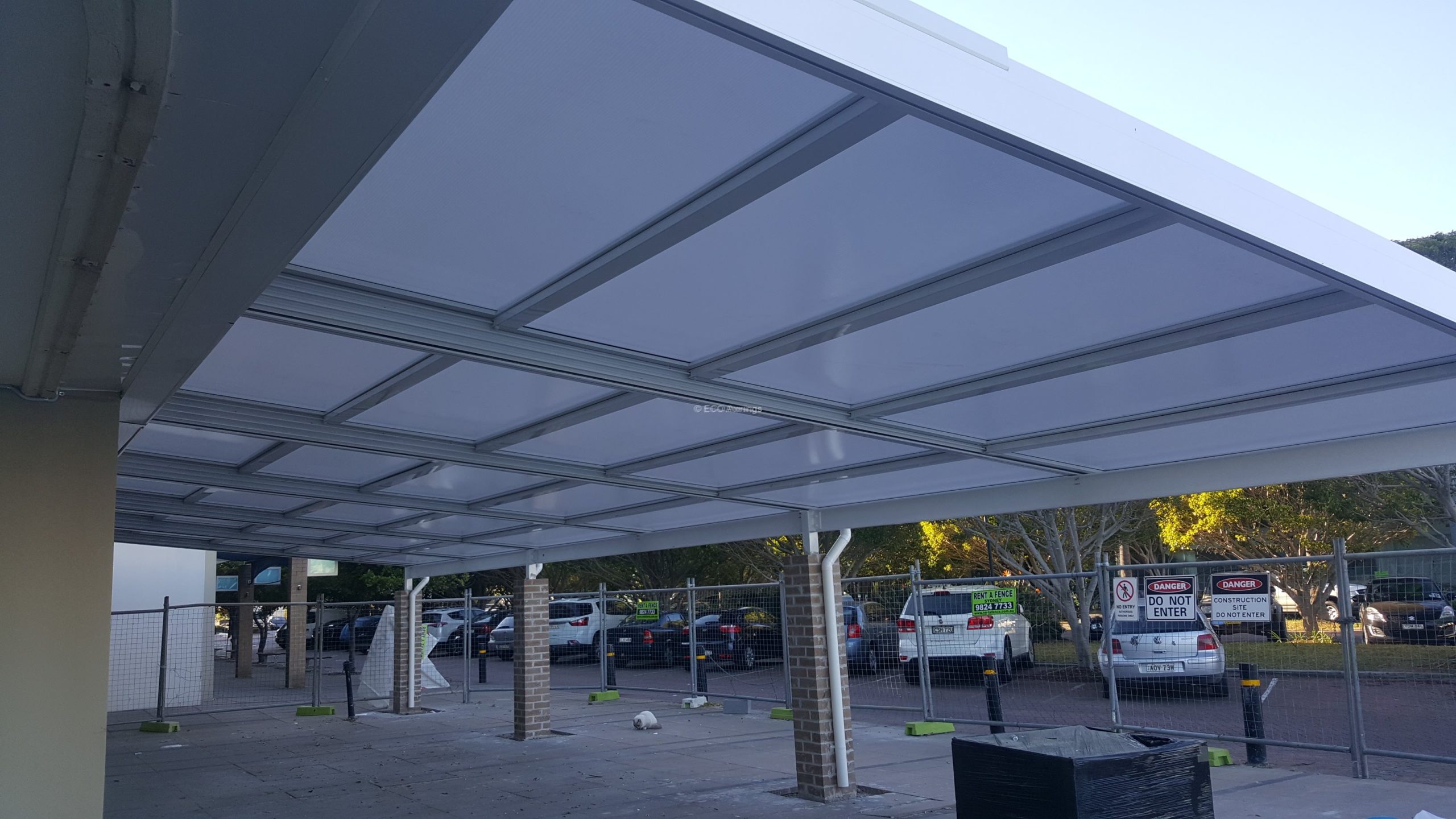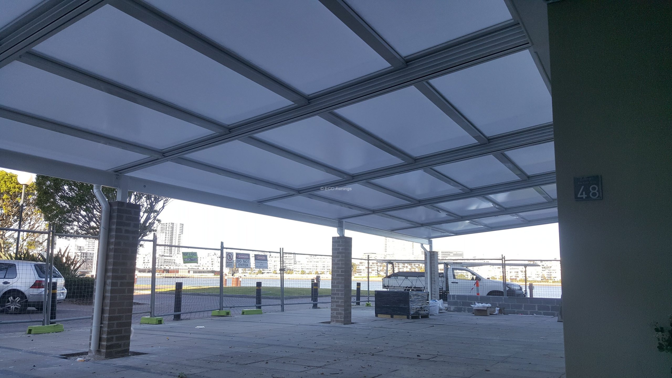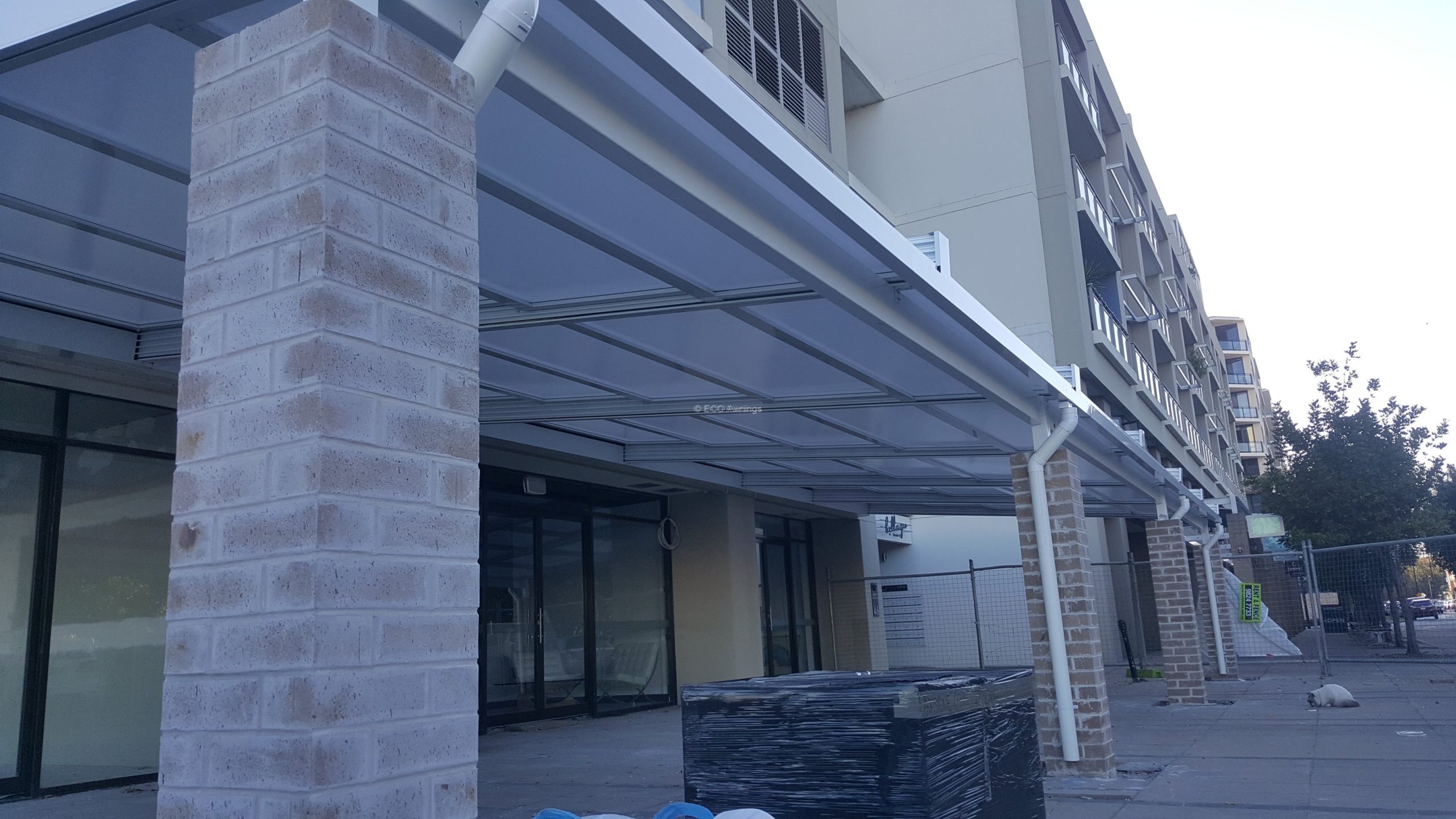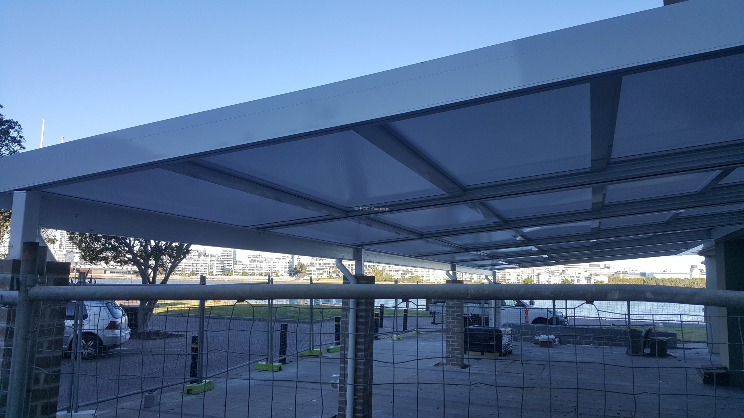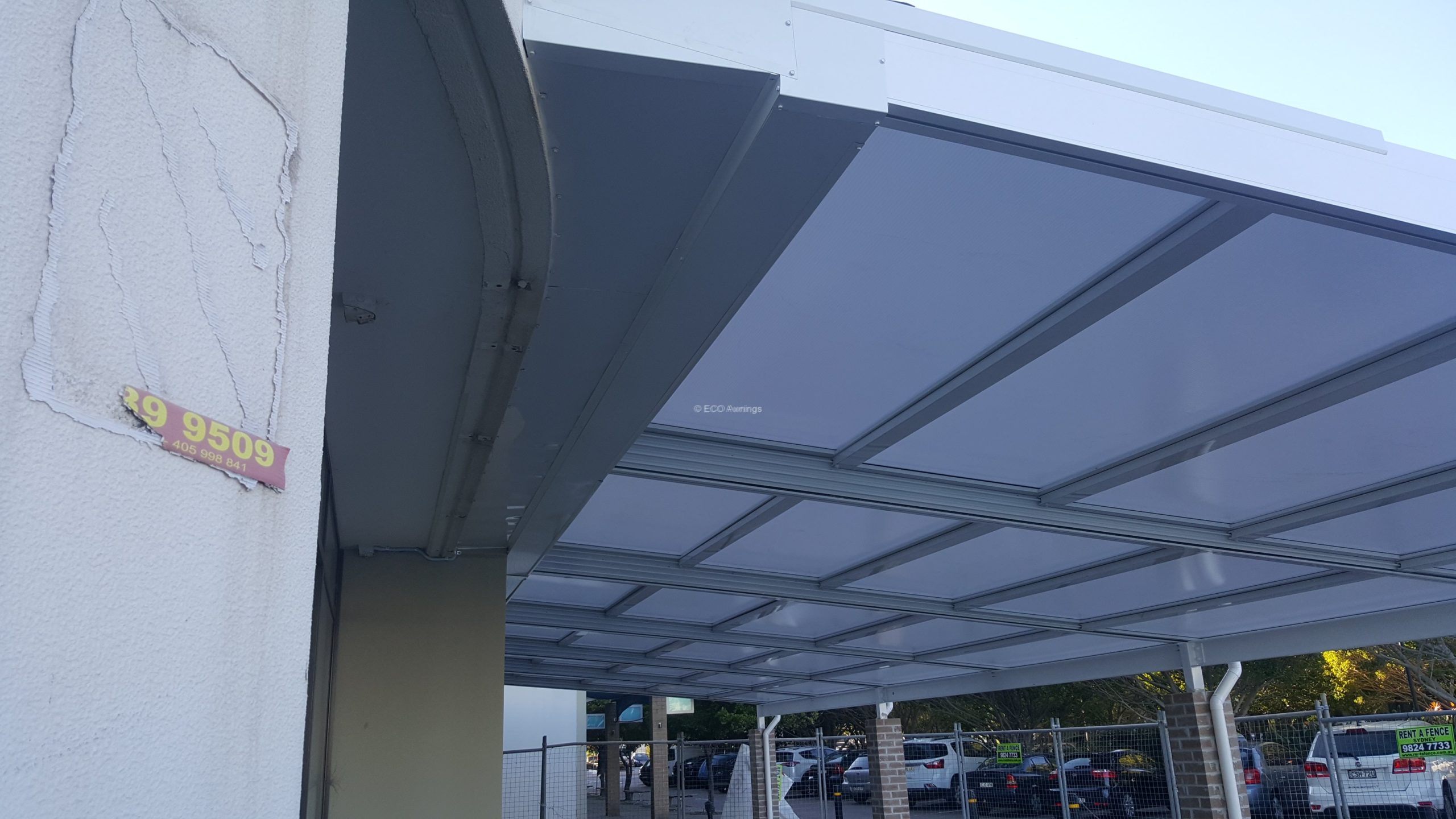 This Retracta Roof with 6 bays, 5 Polycarb Panels and powder coated frame, has been installed at the front of a new Wentworth Point Restaurant site, hence gaining a weatherproof outdoor seating area. The Retracta Roof with 6 bays, 5 Polycarb Panels in this installation requires a minimum roof pitch of 6°. The Retracta Roof with 6 bays, 5 Polycarb Panels can be mounted on an external wall or above a roof line as required, therefore has flexible fitting options.