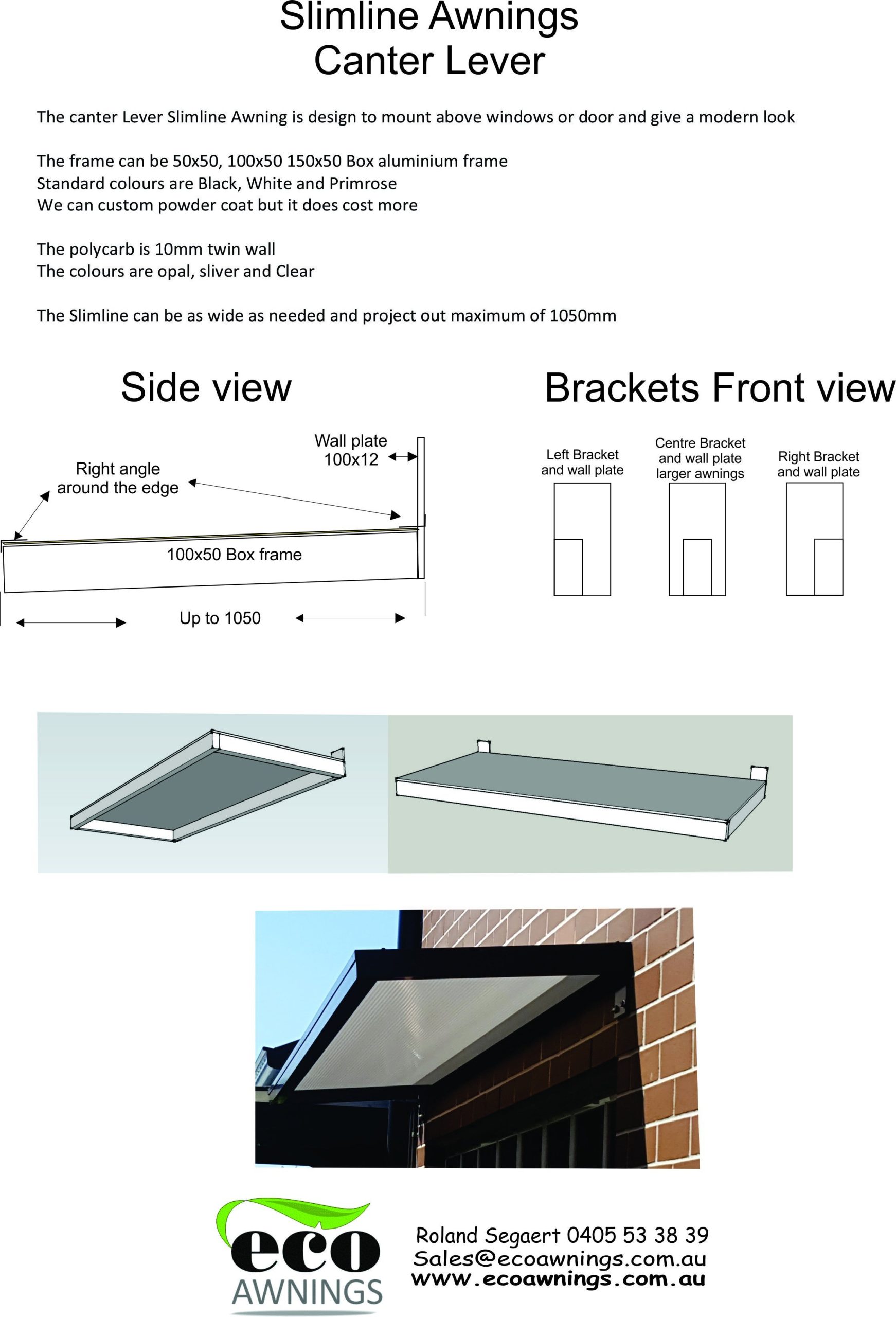The Canter Lever brackets are mount to the wall The awning can be as wide as you need and projected out up to1050mm. The frame can be made with 50x50100x50,150×50, 200×50 powder coated extruded aluminum
